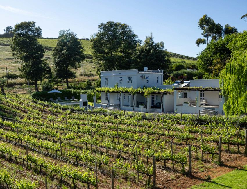 On a working wine estate in the Bottelary Hills, these modern self‑catering villas feature sleek design, private pools and vineyard views. Guests enjoy award‑winning wines, a restaurant, mani‑pedis and an outdoor pool in the Winelands.